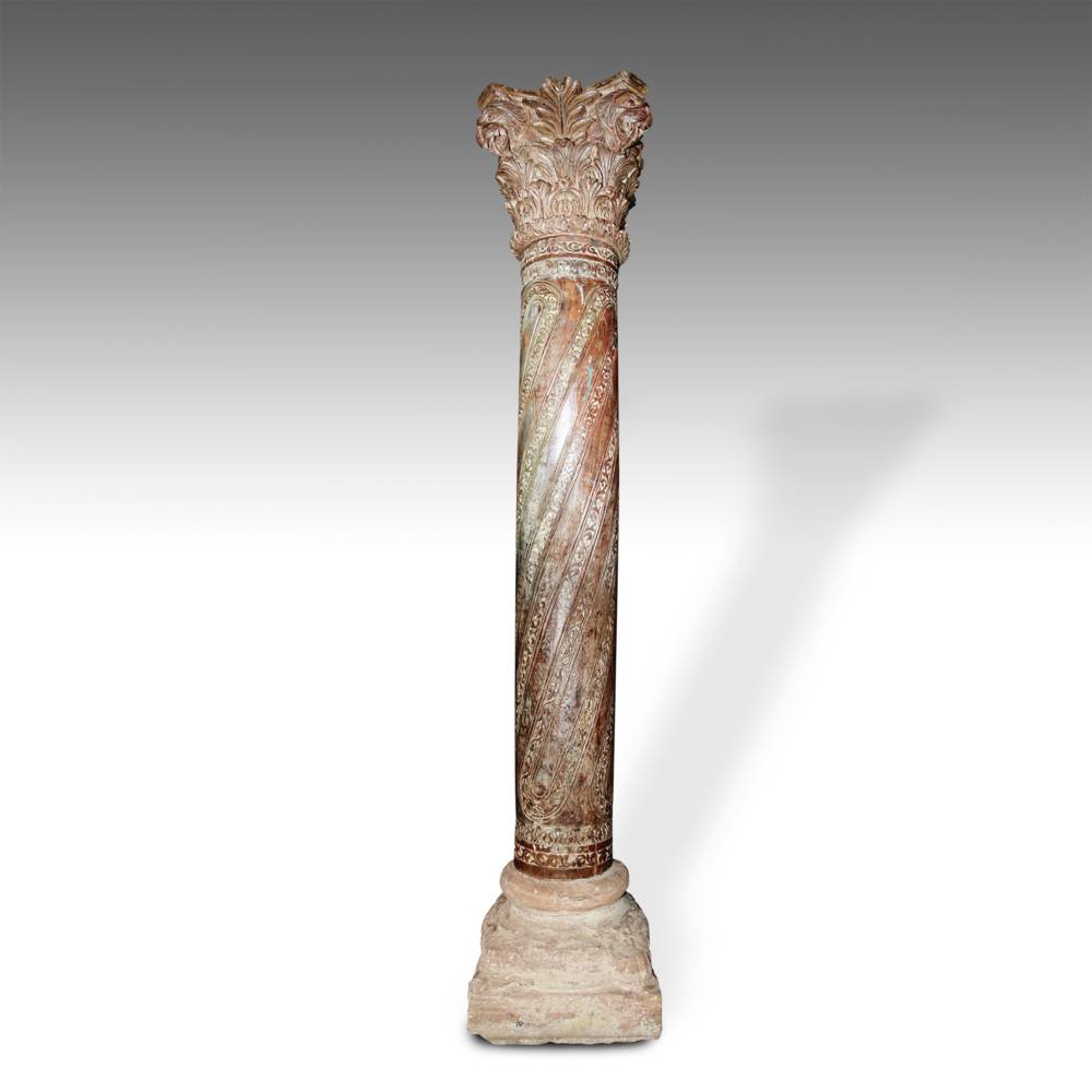 Carved Pillar with Animal Faces on Capitol; Stone Base