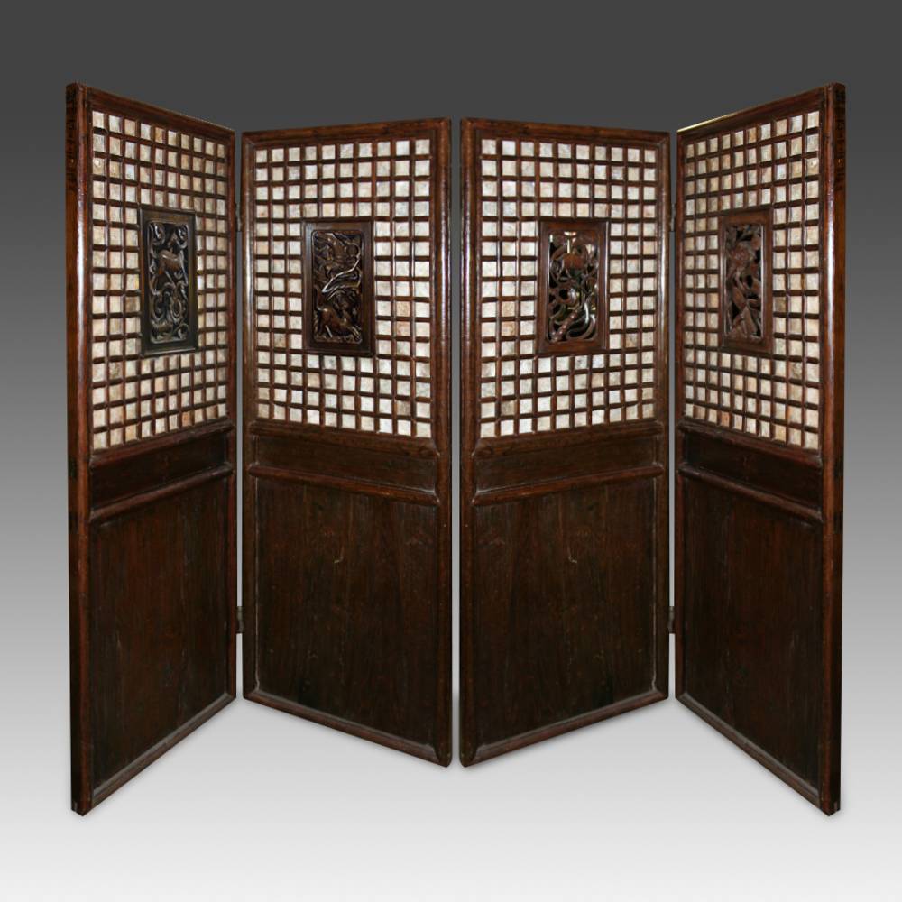 Four Panel Lattice Screen Set; Oyster Shell Inserts with Animal Motifs