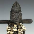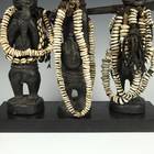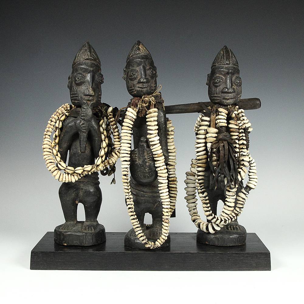 "There is one distinguishing feature of all Esu figures: a long phallic hairstyle protruding from the top of the head and often falling down the back of the head. These sculptures portray both the orisa and his or her devotees. The carving, painted black (deep indigo dye) with long strands of cowrie shells descending from its neck or feet, to which are attached carvings of small mirrors, combs and flutes, as well as small bells, represent Esu's ase, the deity's person and power. Esu crosses boundaries, creates trouble for those unwilling to make sacrifice and brings to fruition human hopes and aspirations." -- from Ibeji: The Cult of the Yoruba Twins, by George Chemeche