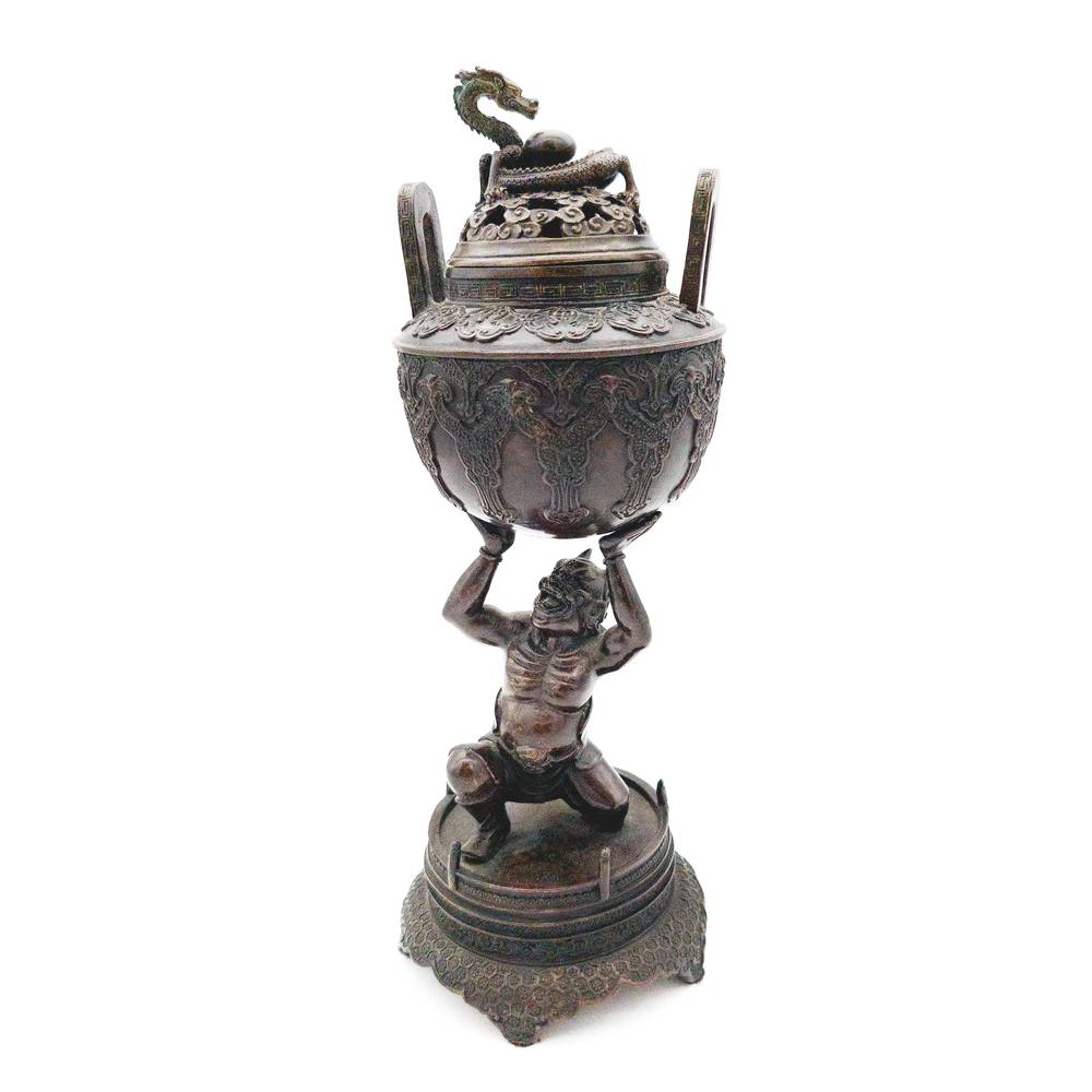 Lidded Censer Depicting Demon Oni Holding Top Burner on Floral base
