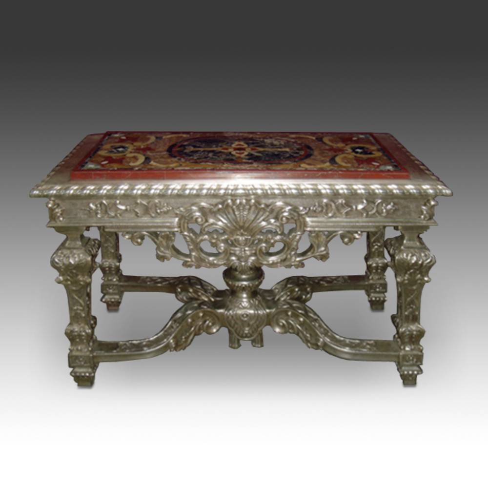 Carved teak wood clad with silver repousse; hardstone marquetry top