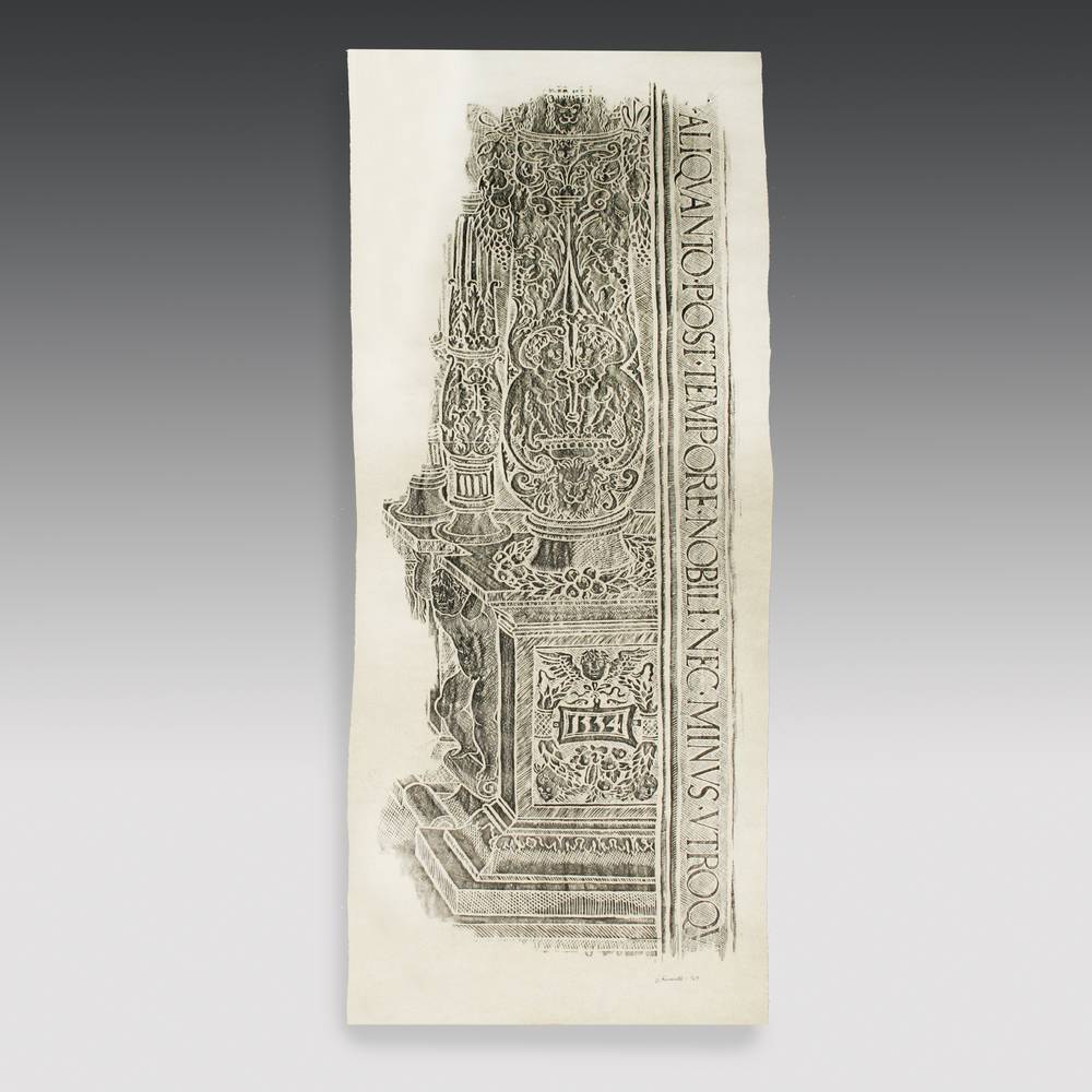 Brass rubbings are reproductions of engraved commemorative plaques, created by placing paper over the plate and rubbing with crayon or chalk. These rubbings were created by Jean Farrell in the 1960s and feature Belgian memorial stones dating from the 14th and 15th centuries. They went on to many private collections as well as museums.