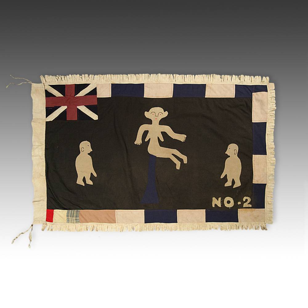 Even though the Akan societies in Ghana had no standing army, the asafo or people's militia, was a well established social and political organization based on military principles. Each asafo group is identified by a particular name and number and through a set of symbols displayed prominently on its flag. Verbal proverbs, a significant facet of Akan culture, are represented by colored cutout figures appliqued on the cotton ground.