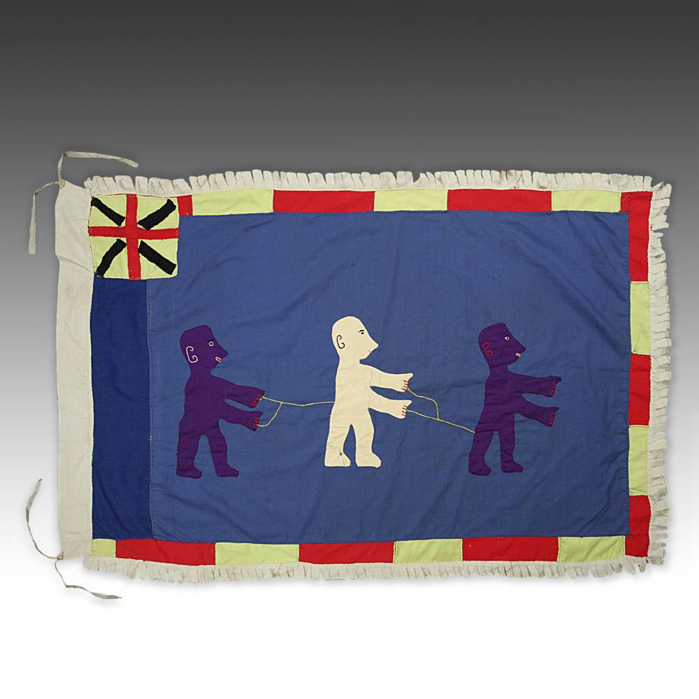 Even though the Akan societies in Ghana had no standing army, the asafo or people's militia, was a well established social and political organization based on military principles. Each asafo group is identified by a particular name and number and through a set of symbols displayed prominently on its flag. Verbal proverbs, a significant facet of Akan culture, are represented by colored cutout figures appliqued on the cotton ground.