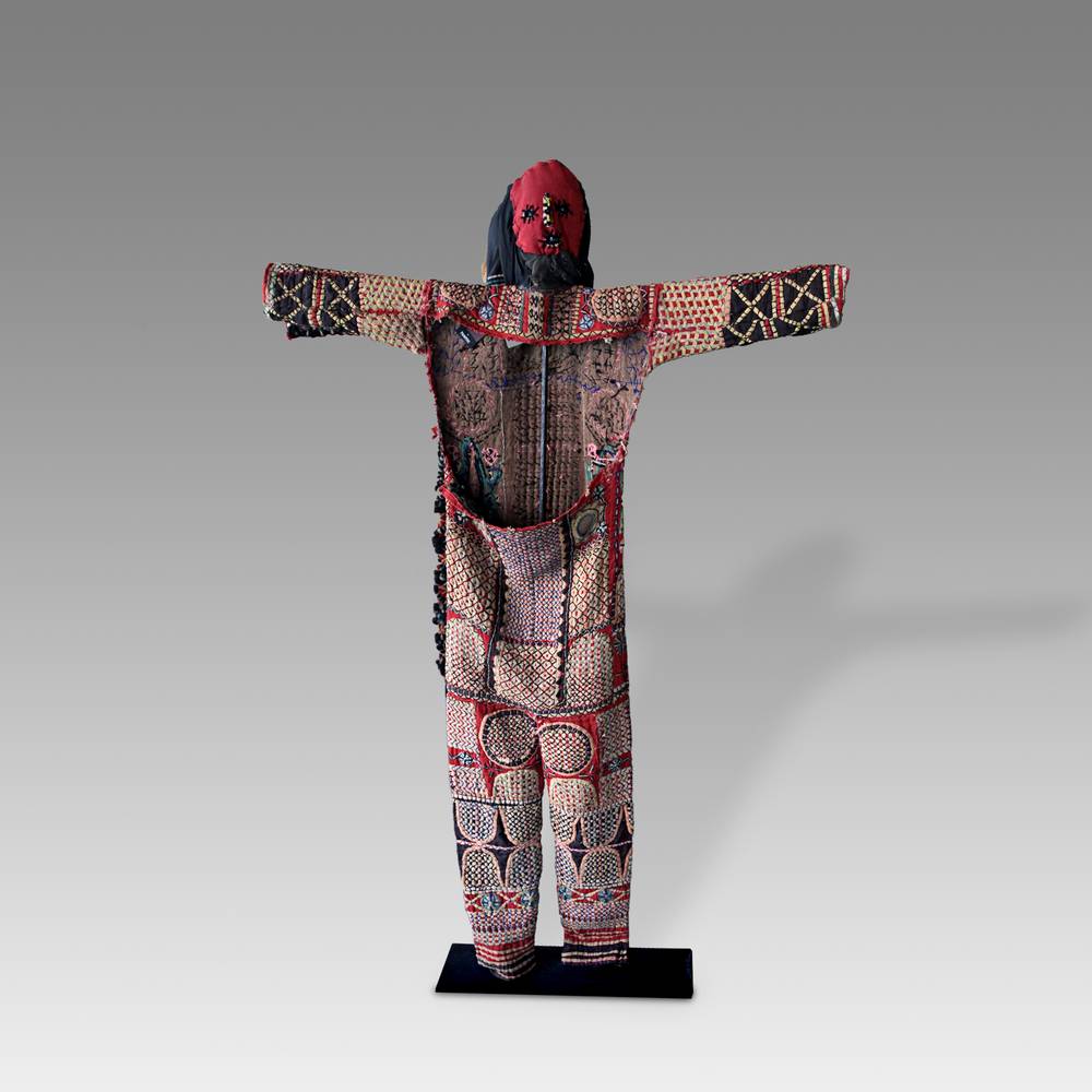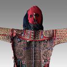 Agbogho Mmuo, or Maiden Spirit masquerades are performed annually during the dry season in the Nri-Awka area of northern Igboland, Nigeria. Brightly colored costumes are made and danced by mature men in their late 20's through 50's. They dance as adolescent girls, miming and exaggerating their beauty and comportment. The designs on the full body costumes are made from different colored appliqued cloth representing the patterns of body paintings called uli.